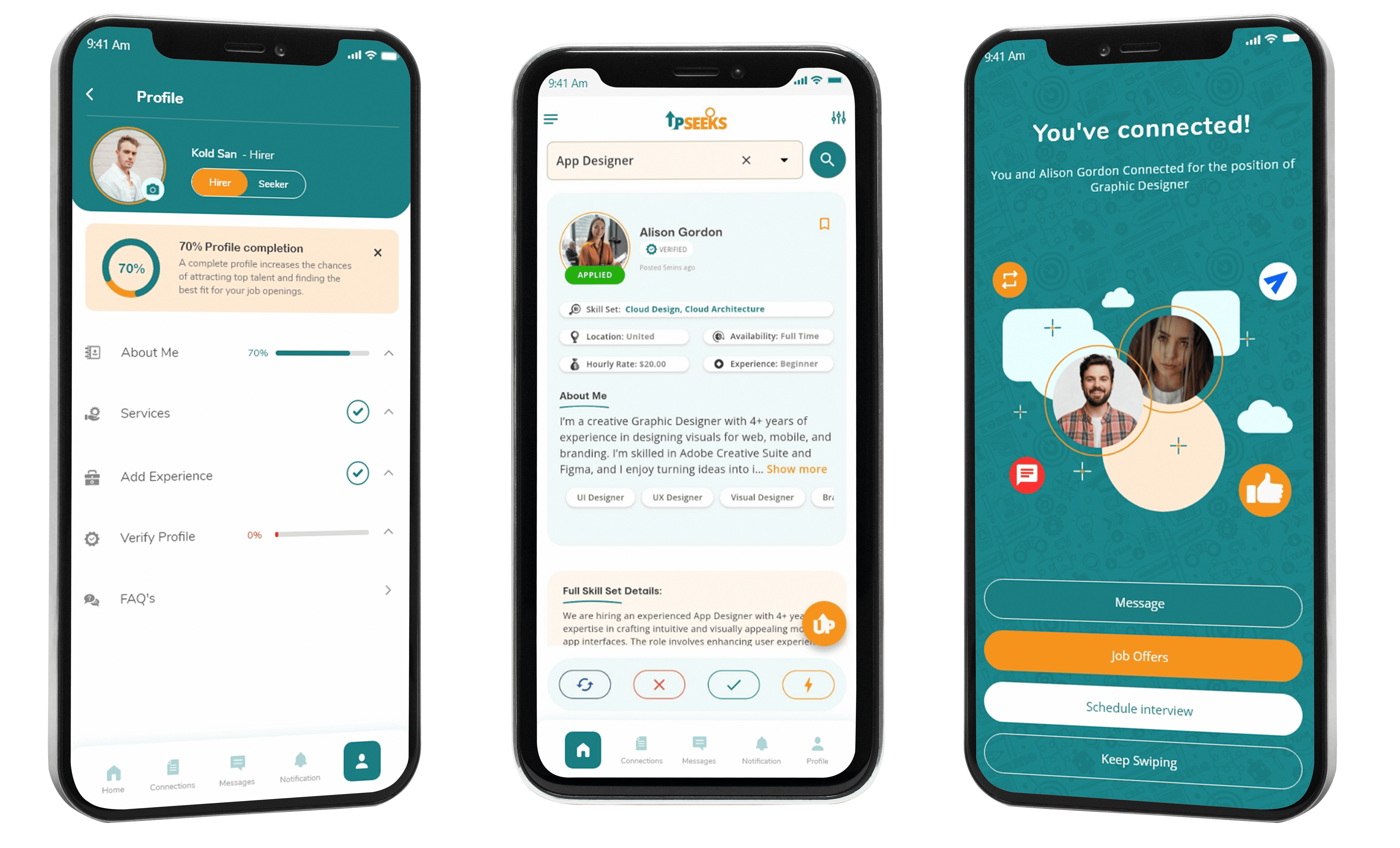 Once users have created their profile, they may begin seeking/providing work. Upseeks utilizes its powerful algorithm to connect the perfect candidate with the advertised job role. If the connection between the job seeker and provider is mutual, a discussion regarding the opportunity begins.